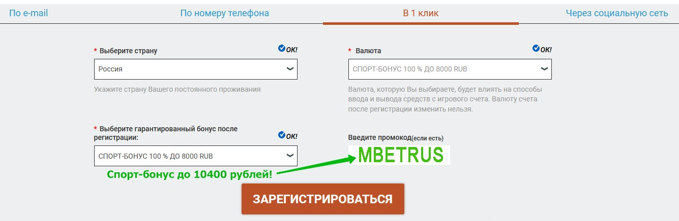 Обычный бонус на первый депозит — до 8 000 рублей. Повышенный бонус до 10 400 рублей — можно получить, если ввести ПРИ регистрации промокод: